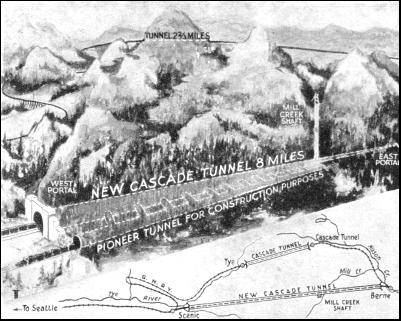 ONE of the most amazing engineering feats of recent years was carried out on the system of the Great Northern Railway of America when a new tunnel was driven through the giant Cascade range from Scenic to Berne. Just on eight miles were completed within three years. This work was hustled through at such speed that tunnel constructions of the past seemed to be only small achievements, and all records for tunnelling were broken. The object of the tunnel was to afford Seattle, on the Pacific Coast, more direct and easier communication with the cities in West and Central America. By the building of the Cascade Tunnel the railway company secured absolute protection from the peril of avalanches and eliminated the cost of maintaining snow-sheds to guard the track. The main line route was shortened by seven and a half miles, while the curves and gradients were also considerably reduced. In 1925 parties of engineers set out to survey the site. Owing to the length of the tunnel it was imperative that the work should proceed from more than two sides, and the surveyors decided that a shaft should be sunk in Mill Creek valley above the line of the tunnel Other problems of preliminary investigation were the location of the tunnel's axis, the estimation of the difference in elevation between the east portal and the west portal, and the depth of the Mill Creek shaft.