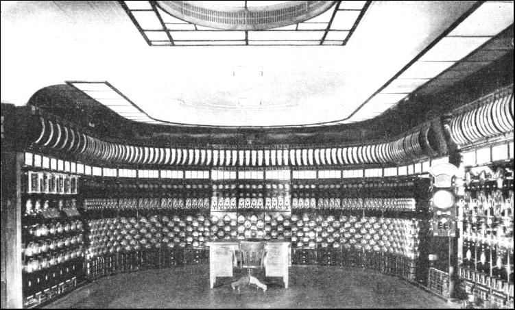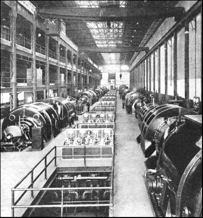 In the turbine-room the turbo-alternators are arranged in two long rows the length of the long room. Each machine consists of a high-pressure turbine cylinder on the right-hand end with the valve and governing gear. From here the steam passes to the centre of the right-hand middle part, which is the low-pressure turbine cylinder divided into two parts, the steam passing to the involutes at the outside ends and down to the condensers. The left-hand middle part is the generator, where the mechanical energy is transformed into electrical energy. On the extreme left hand is the exciter, which regulates the pressure at which the energy is turned out. The most recent type of turbine has a capacity of 18,750 kilowatts, this being about three times as powerful as the original units of 6,000 kilowatts, but occupying very little more ground space. When the original units were installed they were the most powerful in Great Britain, but electricity has made great progress since those days. The control-room is placed above the end of the turbine-room, and a bay window affords a complete view of the plant. Opposite the window are the panels from which the turbo-alternators are operated. In the centre of each panel is the telegraph apparatus for signalling to the driver ; below, on the right, is a hand-wheel by which the speed can be varied, and on the left is a hand-wheel which regulates the voltage. In the middle, between the two hand-wheels, is a switch, by means of which the unit can be connected to the bus bars to give its energy up to the outgoing electrical feeder cables. At the top of each panel are the instruments registering the amount of energy each unit is developing. The controls for the outgoing feeder cables are arranged in a semi-circle at the farther end of the control-room, each vertical unit representing one cable. At the top is the ammeter to register the load, and below this is the name of the substation being supplied. Under this are the number, the alarm indicator, the oil circuit breaker control switch with its pilot lamps—red to show the switch closed and green to show it open—and below again, relays and fuses to protect against faults and defects. In the middle of the semicircle of feeder controls is a telephone exchange, which enables the operator to get into communication with any part of London to which a supply of electricity is being sent. On the right of the control-room are the low-voltage, direct-current control panels, which supply the more important auxiliary plant of the station. On the left are the main metering panels of the generators, where the total output is measured. Although the Lots Road Power Station is not the only source of power of the underground railways of London, it is the chief supply, the maximum load being just over 100,000 kilowatts, which is the equivalent of 134,000 h.p.