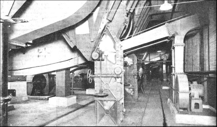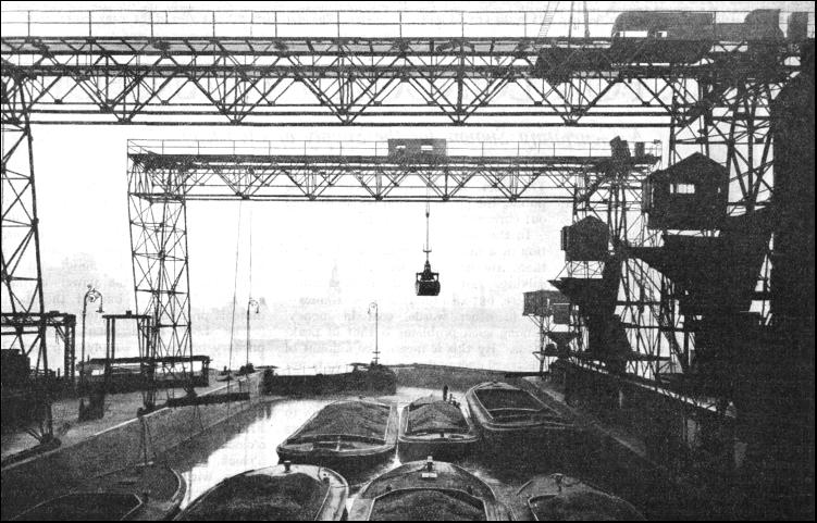 Lines on the chart from the "time" and "output" sides respectively meet at right-angles, and the points of intersection, when joined together, form a graph, showing at a glance the load on the station at any minute of the day or night. On a weekday the graph will show two "mountain peaks" at nine and six o'clock coinciding with the rush hours, with "valleys" between, when the flow of traffic has lessened. Big events in London are reflected in these graphs. Thus, the graph for Jubilee Monday, 1935, shows that the load curve rose sharply between 5.30 and 6.30 in the morning—when thousands of people were travelling by Underground to get to their places, on the route of the Royal procession—and kept practically level for the rest of the day. As factories and offices were closed, there was no rush hour to send it up to its usual peak. Another curve which indicates a piece of history is that for November 29, 1934. This was the wedding-day of the Duke of Kent and Princess Marina, which had the effect of filling the usual "valley" between the rush hour peaks. Lots Road Power Station may be described as a huge machine into which coal enters at one end to emerge as electricity at the other. On an average day, 750 tons of coal enter the power station dock. This amount is converted in the power station to about 1,200,000 kilowatt hours, and is distributed to thirty-five railway sub-stations and ten tramway sub-stations by more than 460 miles of 11,000-volt high-tension three-core cable. The coal arrives in lighters, which are brought into the basin when the dock gates are opened round about high water. The capacity of the dock is such that six lighters, each carrying up to 200 tons of coal, can be berthed under two transporter cranes. The grabs of the cranes unload the coal, which is then weighed and passed on to an endless belt conveyor that carries it to the elevator house. Here it is crushed, if necessary, and then lifted to the top of the building, to be stored in the bunkers over the boilers. About 10,000 tons of coal are stored in a large circular tank on the river side, as a reserve in the event of an emergency that might arise to stop barges being worked into the dock.