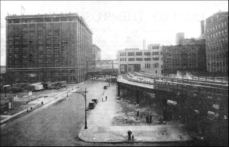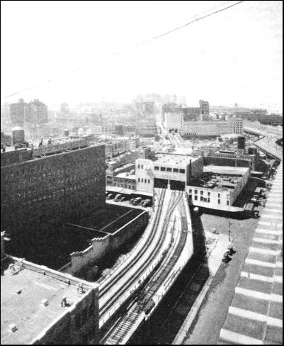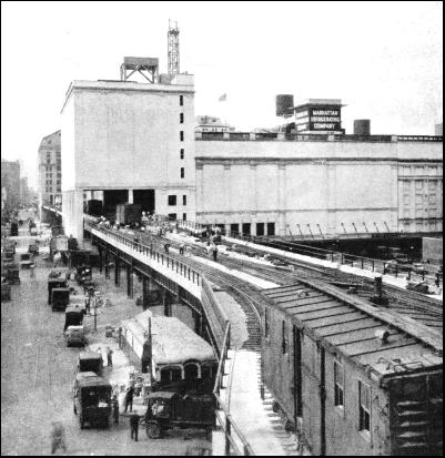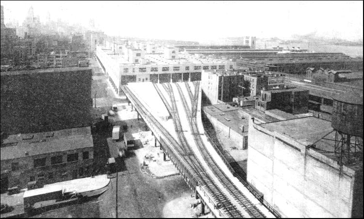 Freight can be handled in both carload and less than carload quantities. As St. John's Park has been the city's chief delivery station for dairy produce for more than half a century the facilities for dealing with butter, eggs, cheese and dressed poultry are adequate. The Customs Service has offices in the building, and a corps of inspectors to attend to goods arriving in bond, which are cleared quickly, and promptly forwarded. Leaving the station and going north, the two main tracks of the line are carried on a viaduct up to Thirtieth Street. Here the line turns west and encircles the goods yard to have sufficient space to overcome the difference in levels between the viaduct and the tracks below street level which are to the north. Provision for building future industrial tracks has been made, and sidings now under construction will afford direct service to many industries. The construction of the viaduct was one of the most difficult problems of the scheme, from an engineering point of view. It is of steel with concrete floor construction, the tracks being carried on stone ballast, except in the packing house district between Little West Twelfth and West Fourteenth Streets, where they are on concrete. The "air rights," that is, the rights of erecting warehouses and factories over the track, are being developed. These new buildings will have direct access to the track by means of sidings. In this way raw materials will be brought into a building by rail, and manufactured on the premises above the track. The finished articles will then be placed in wagons on the sidings so that road haulage is avoided. The saving in having a railway on the premises is expected to lower the cost of manufacture. Most of the work in the initial programme has been completed north of West Seventy-second Street, except for the elimination of the crossings at West Seventy-ninth and West Ninety-sixth Streets by carrying the streets over the tracks. In the Manhattanville district the line has been elevated, crossing over the streets between St. Clair Place and West One Hundred and Thirty-fifth Street by a three-track viaduct. Side-tracks have been provided on this high level to serve a number of packing houses. With train operation on the new viaduct there disappeared one of the picturesque scenes of New York City, the boys on horseback, who under an old by-law had to ride ahead of each locomotive or train passing through the street. These West Side "cowboys" and their predecessors, each carrying a red flag giving warning of the approach, at six miles an hour, of the train he preceded, had been riding up and down the West Side of Manhattan since 1849. When the full programme of improvement is completed throughout, the line will be thirteen miles in length.