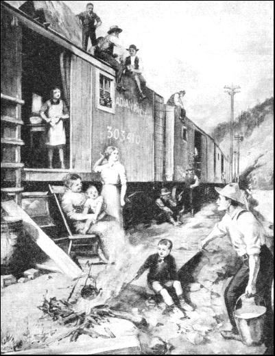 When the rails had passed Port Arthur the constructors battled through the forest lands of Western Ontario to Winnipeg. On this stretch of the track the gradients were carefully watched, and the embankments and bridges made in particularly solid fashion, as it was foreseen that the line would have to carry a vast amount of grain traffic from Winnipeg, the important centre of Manitoba, to the Great Lakes and the Atlantic ports. Fleming's suggested route from Winnipeg was rejected, and the track was laid nearer the International boundary. The reason for this was that the projected route traversed territory which was deemed too cold for settlers. Secondly, the company believed that if the line ran close to the border all danger of a competitive Canadian transcontinental railway being built farther south would be obviated. Also there was the consideration of cost, for although the Yellow Head Pass presented the simplest gateway through the Rockies, it would necessitate a great northward diversion of the track and more extensive bridge building. Time and money were scarce. The shorter route was the more obvious in such circumstances, and so the railway proceeded due west, almost following the line of latitude fifty for some six hundred miles. Among the difficulties later encountered in building the railway over the prairie, report has it that bellicose Indian tribes also harassed the constructors, and that it was largely through the successful intervention of a Roman Catholic priest, the Reverend Father Lacombe, that several serious crises were averted. Embankments were constructed across the prairie wherever the terrain permitted, to afford the metals a better chance against the snow-drifts ; for in winter the blizzards from the Arctic have a clear passage across the prairie, which is in reality a succession of steppes up to the foothills of the mountains. The cuttings were also excavated as widely as possible to avoid channels in which the snow could pile up and so block communication. Work on the prairies then proceeded with a rapidity unparalleled in railway construction. In fifteen months, despite the hardships of a winter, over seven hundred miles of track were laid by the contractors. The labour was broken up into sections, which were let out by the original contractors of the line to "sub-contractors," thus enabling the work to be simultaneously proceeding over stretches of a hundred and fifty or more miles. The labour was divided into five-hour shifts. During the cold the men wore the thickest clothing available ; large gauntlets shielded their hands from frostbite—30 or 40 degrees of frost were not rare—and woollen socks were drawn over the high leather boots to prevent slipping on the ice. The prairie camp of each contractor's "outfit" had a military aspect. One or two large dining-tents with the cooks' quarters and an office tent generally occupied the centre, while around stood lines of small two-men tents, and on the outskirts the horse lines and rows of wagons.