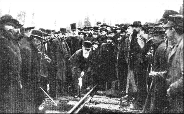 Through the pioneer bore itself ran light railways for the removal of the rubble brought down by successive blasting charges. Apart from the internal excavations, attacks were made upon the mountain from either portal. The result of this "multi-bore" method of construction was that the main passage of the tunnel was clear from end to end after 704 days. Now came further excavations to widen this passage to the full dimensions required for the passage of trains. For this purpose the railway builders' heavy artillery—steam shovels—joined in the battle. These huge machines scraped and dug away at the rock and moved forward on the average some 40 ft. per day ; and as the operations progressed the rate of advance speeded up. The amount of crushed rock these machines handled and emptied into the trucks on the light railway was estimated to have been approximately one million cubic yards. In the wake of the steam shovels came the small army of men whose job it was to line the entire tunnel with concrete. The tunnel was named "The Connaught Tunnel" in honour of the Duke of Connaught, then Governor-General of Canada. The tunnel is notable for the rapidity with which it was built and for the introduction of the pioneer-bore method then employed for the first time. The cost of the tunnel was roughly £1,125,000, but it shortened the route by four and a half miles. Not long after the opening of Roger's Pass, the two railway armies from the west and the east met six years ahead of schedule. The Atlantic and the Pacific coasts of Canada were linked by the railway—the arduous explorations of men like Rogers and Moberly, the persistence of Sandford Fleming and other engineers had not been in vain. On November 7, 1885, Lord Strathcona drove in the last spike at Craigellachie. And later Queen Victoria cabled congratulations to the Dominion of Canada, on the termination of a work her Majesty considered "of great importance to the whole British Empire."