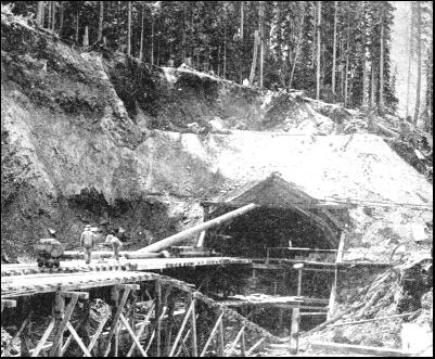 The heavy timbering required by the snow-sheds necessitated special fire precautions, and the sheds were patrolled day and night, particularly during summer. Forest fires were then rampant, adding to the usual danger of the sheds being set alight by a chance spark. The four and a half miles of snow-sheds on the Roger's Pass afforded not only insufficient protection to the rails, but also proved costly in maintenance. Apart from snow troubles, the maximum grade of the track reached as much as 116 ft. per mile. This put severe limitations upon speed and the amount of freight which could be hauled. The difficulties multiplied as the traffic developed, and the railway engineers finally suggested tunnelling the mountain under Roger's Pass. For surveying purposes the engineers climbed the adjacent Mount Tupper, planted a flag on the summit, and measured a route round its base. Mount Sir Donald, which had to be tunnelled, is 4,480 ft. above the line. The actual site of the tunnel is south-east of Roger's Pass, and a new approach line had to be built to the entrance. Although the Canadian Pacific Railway fully realized the immensity of the undertaking (the tunnel would be five miles in length), the company was in a hurry, and one of the contract terms was that the tunnel under Mount Sir Donald should be completed within three and a half years. The most outstanding feature in the building of this tremendous tunnel was the introduction of a preliminary, or "pioneer," bore, a small tunnel driven 50 ft. to one side of the planned entrance of the real tunnel. Then short galleries were blasted out at right angles to meet the centre line of the tunnel. When the excavators hit this centre line, they again turned at right angles in order to hew out faces in the main tunnel. As each gallery presented two working faces, a large number of labourers could work simultaneously, and could also carry out their blasting operations without disturbing work in adjacent galleries. The blasting was continued night and day, the smoke being dispelled by a draught through the pioneer bore.