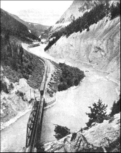 On the western portion of the C.P.R. the company decided to invade the Rockies, with Calgary as their base and the Bow River as their route. The Government's conditions were that the mountain transit must lie at least one hundred miles north of the American border and that the gradient must not exceed 106 ft. per mile. The railroad began by covering a natural entrance called "The Gap," then the rails were carried up to the summit of Kicking Horse Pass—5,329 ft. This is known as "The Divide." The construction over the summit was in the nature of a march, and offered no real obstacles, but the steep descent of Yoho Valley would have faced the engineers with a large amount of tunnelling had the 1 in 50 grade been preserved. So a temporary line, with a grade of 237-1/2 ft. per mile, was constructed, in a more or less direct course down this deep defile. The engine-drivers learned to abominate this section between the Great Divide and Field, which they dubbed "Big Hill." Trains had to be kept under the most careful braking control in descending the incline, and "trap" sidings were laid to catch runaway trains, in the event of such a casualty occurring. "Big Hill" was a costly business, too, from the operating point of view ; to work 700 tons of freight up it required the services of four powerful locomotives, two at the head, and two as "pushers" behind. At length the company decided that "Big Hill" should be abolished, and the railway re-aligned through the Yoho. Valley. The engineers suggested a bold solution of the problem—the construction of two spiral tunnels to ease the gradient. The new route, no steeper than 1 in 45, crosses the Kicking Horse River and enters the Mount Ogden tunnel on the opposite shore. This tunnel measures over two thousand feet in length, and the train turns a complete circle inside, climbing all the time, and emerges from the exit portal high above the entrance. It next crosses the river again, doubles upon itself, runs parallel with the first stretch of line in a reverse direction, and finally enters Mount Stephen to complete another circle, after which it rejoins the old line. The actual boring of the tunnels was carried out from both ends at once. The incursions of water necessitated an extensive use of pumps, while the tunnels had also to be lined with concrete. The drilling continued even at night, the work being carried on by the light of flares. The cost of these tunnels bordered on a quarter of a million sterling, and over 1-1/2 million pounds of dynamite were used tor blasting. When, on the transcontinental railway, builders had overcome the Rockies by means of "The Great Divide," the engineers found themselves opposed by an even more formidable barrier—the Selkirk range. It was decided that the key to the Pacific coast was "Roger's Pass." and accordingly the railway was carried up from Golden to an altitude of 4,300 ft. Quite apart from the constructional difficulties, winter snows threatened to bury and destroy the metals, despite the protection of the numerous timber snow-sheds erected to cover the track. These were of varying designs : one of the most remarkable patterns caught the tailing avalanche or snow-drift and threw the mass clear of the line, the amount of the clearance depending upon the speed of the avalanche. Also V-shaped or split fences were placed high up on the mountain slopes so that they divided and broke the force of the sliding snow masses. To give some idea of the gravity of the snow-slides, it is worth mentioning that avalanches on the C.P.R. have been known to exceed a million tons, travelling down the hillside at a speed of sixty miles an hour !