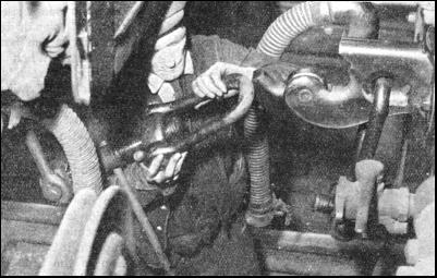 Slip couplings are of two types ; in one, the draw-hook is hinged, and in the other, the shackle is jointed instead. In the former, the part of the drawbar which passes through a steel plate fixed to the headstock or end sill of the carriage frame is the same as on an ordinary coupling ; but the hook itself is hinged at the bottom, which allows the "nose" of the hook to swing out forward and fall down, thus freeing the coupling shackle. When the hook is closed a sliding bar projects from the headstock just above the coupling, bears on the end of the hook, and prevents it from lifting and falling forward. The other end of the sliding bar is connected to a lever in the guard's van. The hinged shackle works on a fixed hook. It is very simple in action, and operates in precisely the same manner as a common snap padlock, with a catch held in the closed position by a spring. A stout cord or chain is attached to the catch ; and on this being pulled by the guard, the shackle flies open (just as the padlock shackle does when the key is inserted and turned) and falls off the draw-hook. The brake hoses will uncouple of their own accord if they are pulled into a straight line, remaining coupled only while they hang down in a curve ; so there is no difficulty in disconnecting brake pipes. As, however, the brakes would go on automatically in both parts of the train if the pipes were left open, provision has to be made for closing them. On some coaches fitted with air brakes, a small trap-door is provided just above the angle cock on the train pipe at the end of the coach. The slip guard shuts the cock on the slip through this trapdoor. The cock at the rear of the main train is then closed automatically just before the slip is made ; and, where the trains are steam-heated, the cocks on the steam pipes can be shut off as well. Sometimes no trap is provided, but the cocks are arranged inside the brake compartment instead, close to the lever which operates the hook.