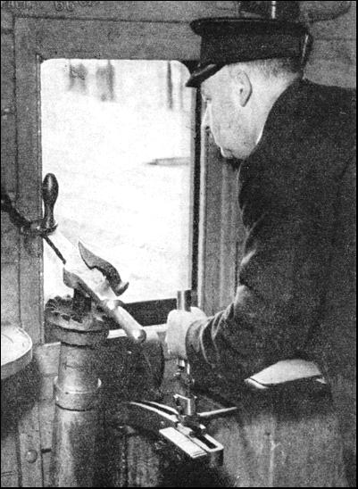 With the vacuum brake, the guard admits air to the train pipe for a brake application ; to release brakes, he puts his handle to "release," which immediately connects the train pipe with the highly exhausted vacuum cylinder. This extracts the air from the train pipe, and the brakes become released. As the slip-coach has neither air pump nor vacuum brake ejector, this could not go on indefinitely, but three or four applications can be made. This, however, is rarely necessary, as the slip guards are usually as "handy" with their brake valves as the engine driver. Great care is always taken in the manufacture and maintenance of the slip apparatus. It must not only be unfailing in its action, but it also has to operate on what one might term "split-second schedule." A small hesitation, or premature operation, may give the passengers the nasty jolting of a violent stop, or else the slip portion will not coast to the station. The hinged hooks, shackles, sliding bars or catches, etc., are made of wrought iron or steel, and case-hardened to withstand wear ; they are usually well coated with oil. The cock-plugs, etc., are periodically treated with graphite or grease, so that they shall not stick nor work stiffly. When attaching a slip-coach to the train, the coupling is never screwed up quite tightly; if this were done, it might put such a tension on the shackle or hook that the guard would be unable to release it. It is the guard's duty to examine and test the slip apparatus before the train leaves the terminal. This especially applies to the cocks on vacuum pipe couplings ; these are tested by getting the engine driver to blow up about 23 in. of vacuum, when the guard pulls the string closing the cocks, disconnects the couplings, and examines the gauge in the van, which will indicate if air is leaking in. When a slip is about to be made the slip guard, having satisfied himself that the signals are off, and that the train is running at the usual speed, applies the hand brake very slightly, to put a little "drag" on the coupling, closes the brake pipe cocks and releases the hook or shackle. He then applies his brake a little harder, and the two parts of the train separate. The train guard, as soon as he sees that the slip has been made successfully, gives the "all clear" to the engine driver, usually by showing his green flag—or a green light at night—from the window of his van, and the driver proceeds. Meanwhile, the guard of the slip portion releases the hand brake and lets his coaches coast along to the station, where he brings them to a standstill by the platform, either with a further application of the hand brake or by the continuous brake as described above.